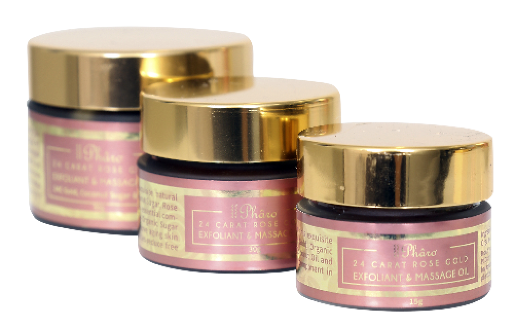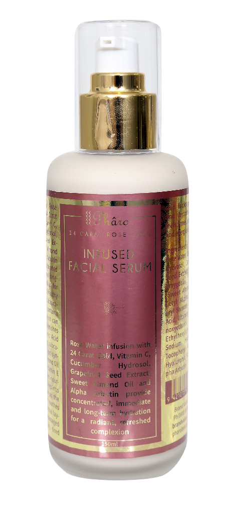 Phâro Infused Facial Serum is in-fused in a Rose Water base, 24 Carat Gold with Vitamin C, Cucumber hydrosol, Grapefruit Seed Extract, Sweet Almond Oil and Alpha Arbutin provide concentrated immediate and long-term stimulation for a radiant and healthy skin.